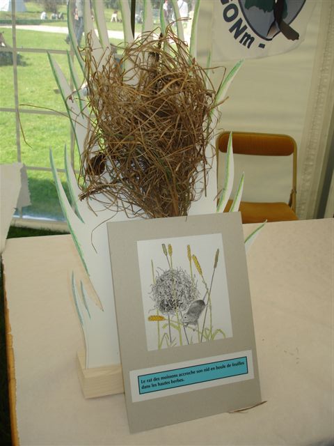 Stand du GONm, fête des oeufs, château de Crévecoeur-en-Auge/14; 8 avril 2007 Présentation du nid du rat des moissons. Jean Collette