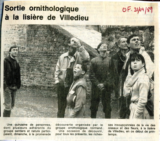 A la demande de l'association "Sentiers et nature" de Villedieu, j'avais organisé une petite sortie de découverte des oiseaux autour de Villedieu/50 le dimanche 16 avril 1989. D'après mes notes, il y eut 10 participants et non "une quinzaine" (mais une erreur dans ce sens là est plus supportable pour l'ego de l'animateur que l'inverse!)
